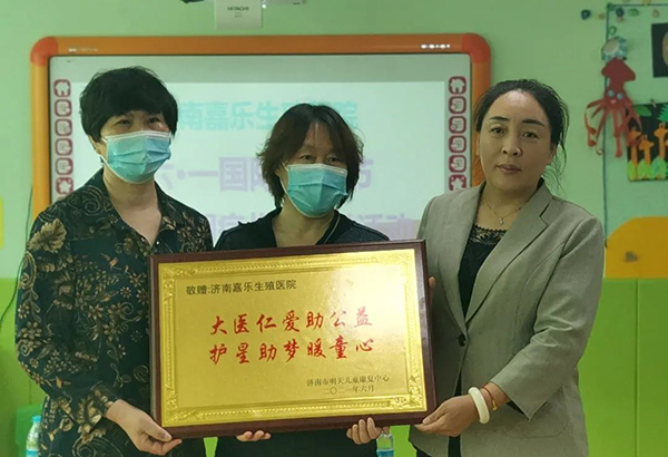 活动中,济南市明天儿童康复中心主任刘梅对济南嘉乐生殖医院爱心志愿者的到来和善举表示感谢,并向济南嘉乐生殖医院颁赠爱心公益牌匾。她表示自闭症的发病率高达1/56,每56个孩子就有一个患有自闭症,而且自闭症是一个伴随终身的精神障碍疾病,是一个困扰家长、老师和社会的难题,虽然孩子的症状经过培训可以得到相应改善,但仍需要社会各界的广泛关注和支持,让他们的康复之路走的更宽、更广。